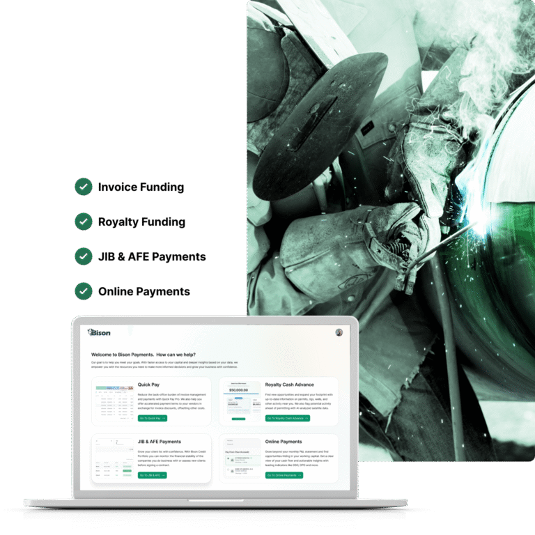 With Bison Payments, EnergyLink users can now access Royalty Cash Advances, pay JIBs with the click of a button, and make secure online payments using credit cards, debit cards, ACH and wires. Stay tuned as we roll out additional payment and funding capabilities for operators, royalty owner, and working interest owners across the EnergyLink platform!