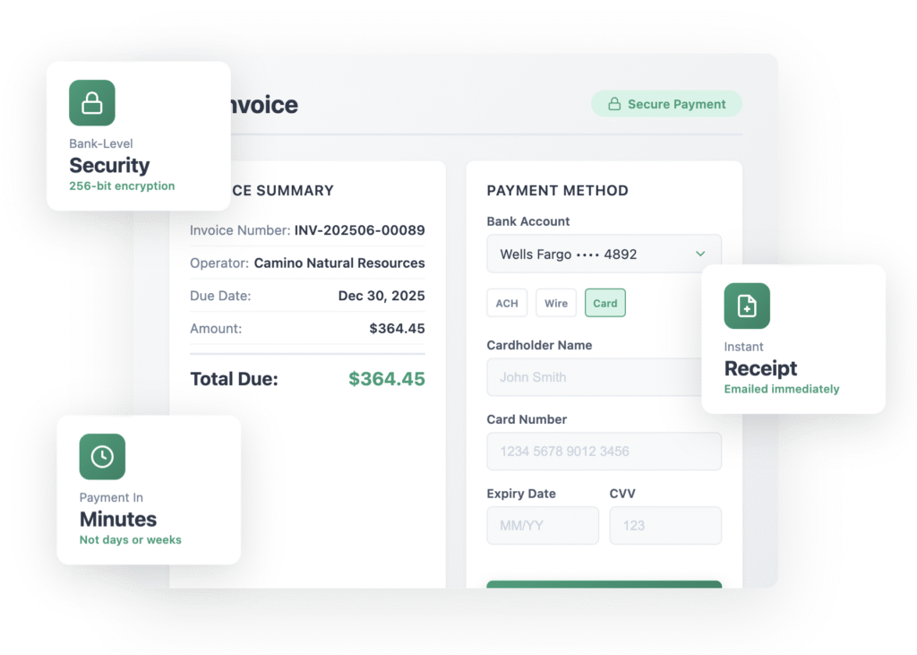 The energy industry moves fast. Your payments should too. Our platform delivers secure, automated payment solutions that eliminate manual processes, reduce errors, and give you complete visibility over every transaction. No more checks. No more waiting on payment.